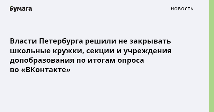 Учреждения дополнительного образования в Петербурге по итогам опроса решили не закрывать на время осенних каникул из-за роста заболеваемости коронавирусом. Об этом сообщила вице-губернатор Ирина Потехина на странице во «ВКонтакте».