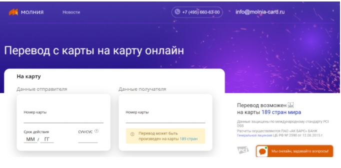 Например, отправка денежной суммы на сайте сервиса molnia-card.ru занимает у клиентов несколько минут. За это время отправитель успеет ввести данные личной банковской карты, номер карты отправителя и сумму.