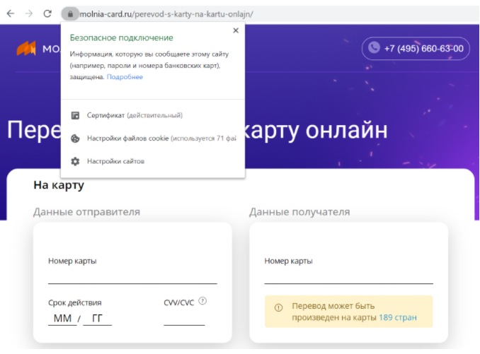 Подтверждением безопасности совершения операций на сайте сервиса «Молния» по переводу с карты на карту онлайн является аббревиатура «https://» и «замок» в адресной строке.
