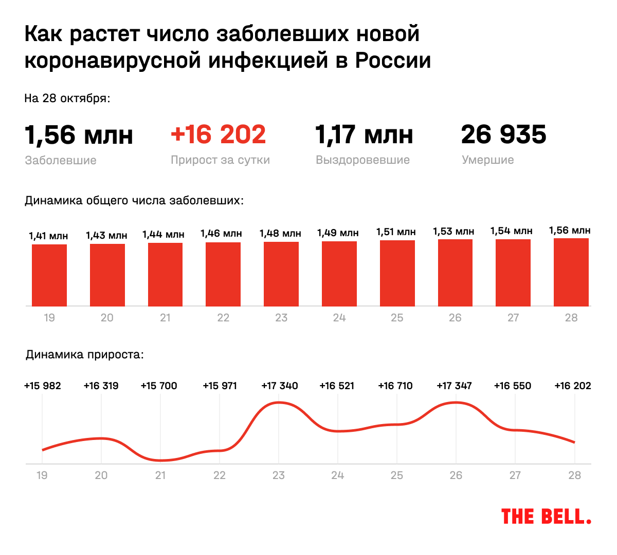 Среди новых случаев заражения 3670 приходится на Москву, 727 — на Санкт-Петербург, 505 — на Московскую область, 377 — на Нижегородскую область. Всего в стране к 28 октября выявлено 1,56 млн зараженных.