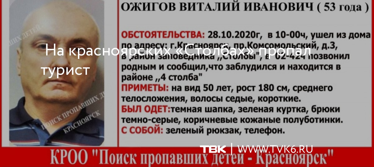 Утром 28 октября 53-летний красноярец Виталий Ожигов выехал из дома с пр. Комсомольский и направился на «Столбы». В 02:42 ночи он сообщил родным, что заблудился в районе 4-го столба.