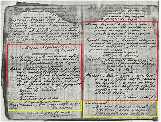 По сравнению с печатными публикациями ксерокопия удобна тем, что на развороте хорошо видно расположение отдельных записей относительно друг друга, и по их расположению часто можно понять, когда записи были сделаны. Записные книжки Ерофеева — это именно записные книжки, в которых выписки из книг перемежаются дневниковыми записями, списками адресов и телефонов и прочей справочной информацией. Как уже было сказано, Ерофеев заполнял их не последовательно, от первой до последней страницы, а более сложным образом, и принципы заполнения не всегда ясны. Тем не менее можно выявить некоторые тенденции или закономерности. Например, Ерофеев часто был склонен заполнять листы записной книжки как бы вдоль разворота: следующую запись делать не под предыдущей, а на соседней странице рядом. Поэтому выписки, сделанные в одно время из одной книги или одного журнала, на страницах ерофеевских блокнотов часто образуют нечто вроде горизонтальных слоев. Так, на ксерокопии ниже, взятой из той же записной книжки 1969–1970 годов, можно увидеть два таких слоя: выше — выписки из Розанова (для наглядности мы выделили их красным), ниже — выписки из Баратынского (выделены желтым):