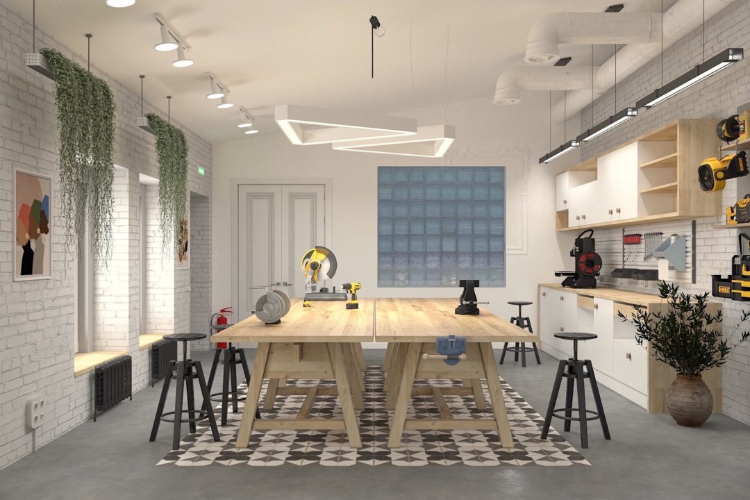 В «Гараже» откроются столярная, швейная и керамическая мастерские. Всё рабочее пространство будет поделено на два блока — «грязный цех» с ЧПУ и фрезерным станком и «чистый цех» с оборудованием для создания изделий из ткани и керамики. Обучение проведут мастера — к ним можно записаться на курсы и сделать проект.