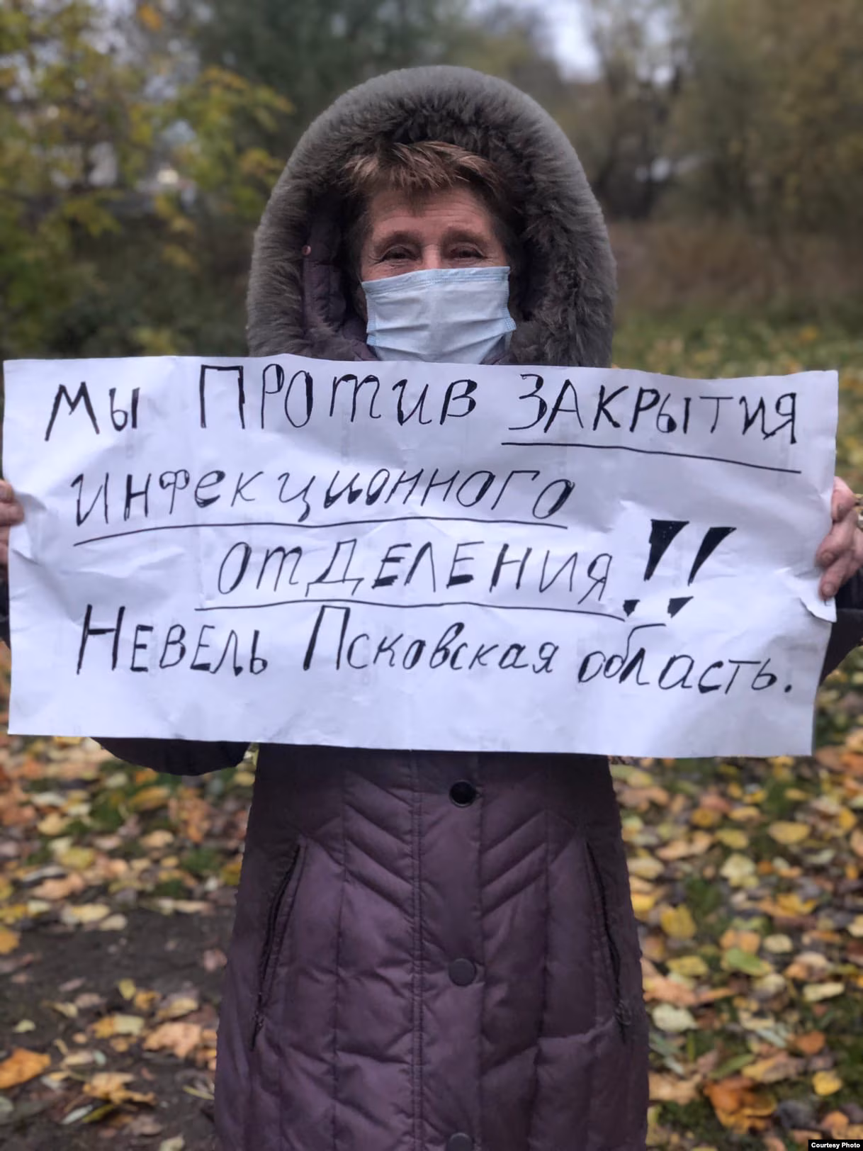 - 30 октября накануне митинга в Невель на встречу с активистами приехала первый заместитель губернатора Псковской области Вера Емельянова. Как рассказала Север.Реалии Клокова, чиновница пыталась убедить жителей, что о закрытии отделения речи якобы не идет. Но в пресс-релизе, который вышел по итогам встречи на портале ПАИ, указано, что больные со средней и тяжёлой формой инфекционных заболеваний будут отправлены каретами скорой помощи в Великолукское подразделение инфекционной больницы.
