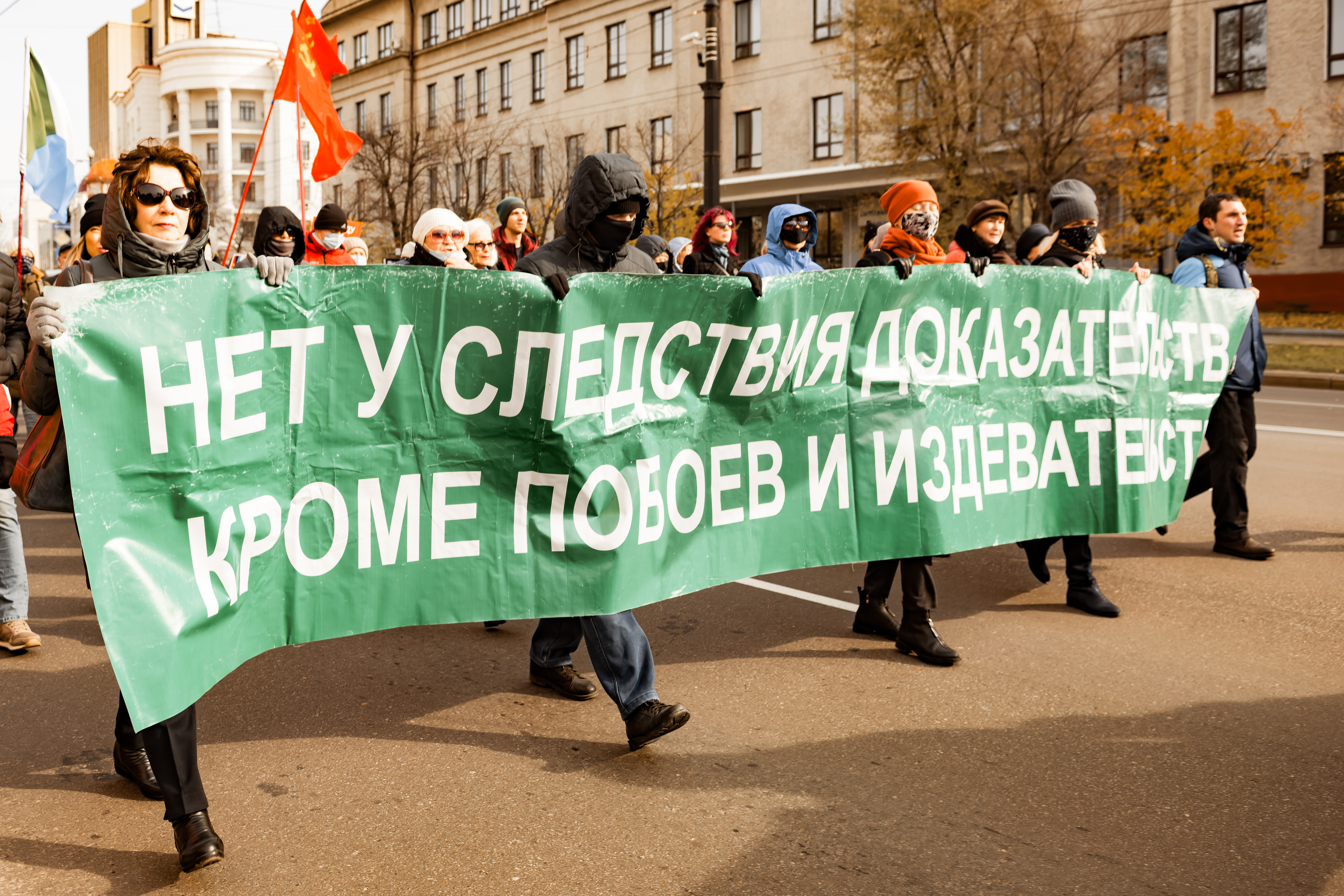 Между тем в шествии протестующие снова скандировали "Свободу", "Партию ЕдРо в помойное ведро", "Путина в отставку", "Свободу Фургалу", "У ОМОНА начались схватки, кладут народ на лопатки", "Нет у следствия доказательств, кроме побоев и издевательств".
