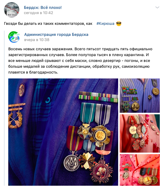 Болдырев репостнул в свой паблик «Бердск: Все плохо!» пост из группы администрации Бердска, сопроводив его словами «Гвозди бы делать из таких комментаторов, как #Кирюша».