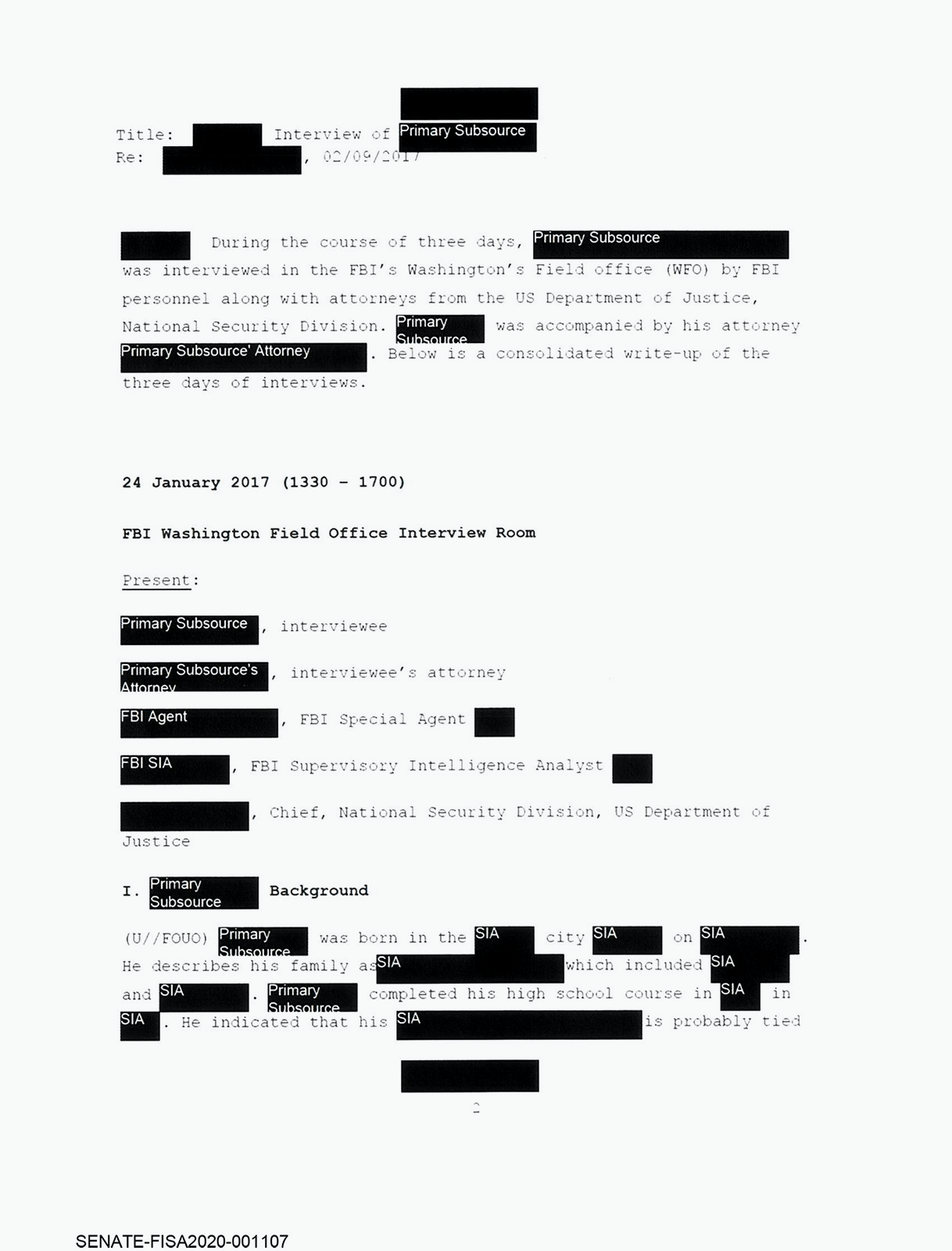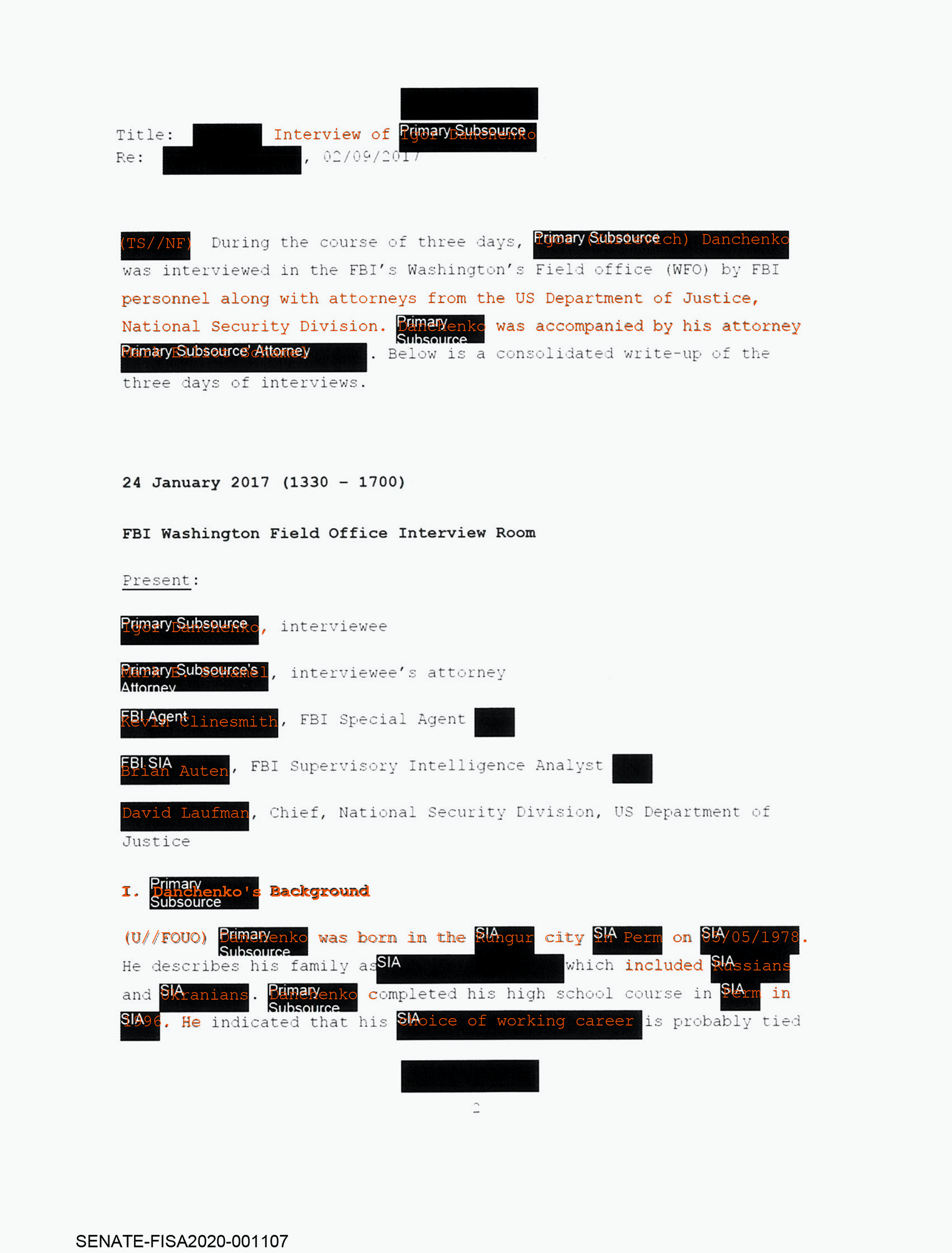 При этом сотрудники ведомства скрупулезно отметили вымаранные куски в отчете ярлыками. Человек, с которым общались агенты ФБР (сам Данченко), назван «исходным вспомогательным источником» (Primary Subsource). Люди, от которых он получал информацию, стали номерными источниками (Source 1, Source 2 и так далее до цифры 6). Аналогичным образом спрятали имена россиян: офицера разведки (Russian Intelligence Officer), бывшего офицера разведки (Former Russian Intelligence Officer), государственного служащего (Russian Government Employee), должностного лица (Russian Official), журналиста (Russian Journalist), нескольких американских жителей (USPER, USPER 2) и некоторых других людей (Friend, Russian Contact, Surname).