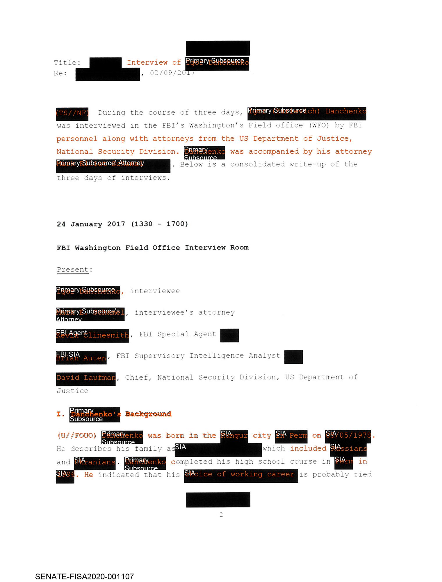 The FBI report published on July 17, 2020, that summarizes three days of interviews with Igor Danchenko doesn’t mention his name or identify other sources, but the redacted excerpts are meticulously marked with labels like “Source 1,” “Russian Intelligence Officer,” and “USPER [U.S. person].” The edits describe Danchenko as the document’s “Primary Subsource.” It took a group of anonymous bloggers just two days to make the connection.