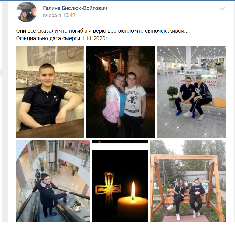 На своей странице "ВКонтакте" она сначала написала, что верит в то, что ее сын живой, но тут же попрощалась с ним: "Официально дата смерти 01.11.2020 г.".