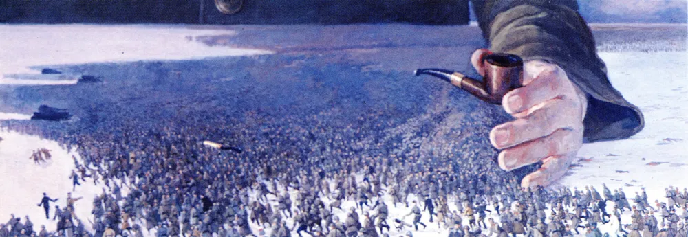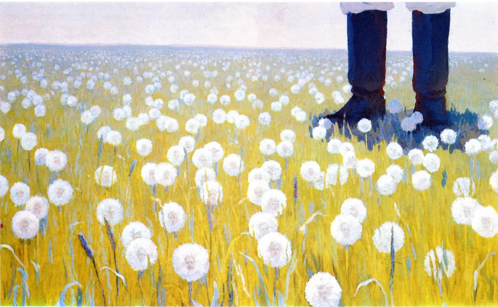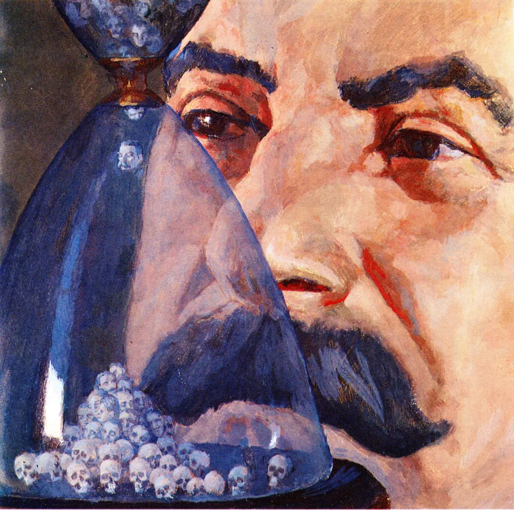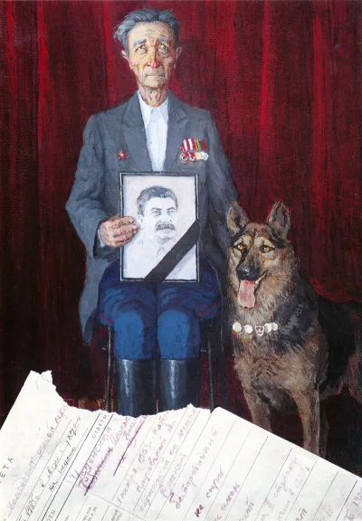 — Сапоги Сталина стоят на хрупких одуванчиках, и в каждом одуванчике — судьба человека, в каждом одуванчике — человеческое лицо. И эти лица папа брал со старых семейных фотографий. Это конкретные люди, но исторически узнаваемых личностей там нет. Если Горький, чья голова падает из песочных часов, узнаваем, то лица в одуванчиках — условные.