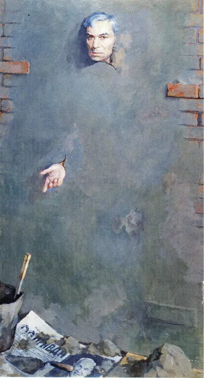 По делу Бориса Пастернака материалов было больше. Эта картина родилась из фразы Пастернака в его дневниках: «Меня словно замуровали в стену». Поэтому на ней — замурованное тело, открыты только лицо и рука. Сначала на картине были еще грубые ботинки, выступающие из стены. Потом папа их замазал, и вниз лег листочек страницы «Правды» с портретом Хрущёва, который санкционировал травлю Пастернака за «Доктора Живаго». Этот роман мы читали в самиздатовских копиях, текст порой был плохо виден. Его тоже читали по ночам, потому что роман давали на очень краткий срок. Я тогда уже была взрослой, и мы с папой буквально передавали страницы друг другу. Отца очень волновала судьба Пастернака.