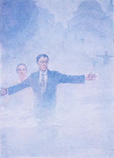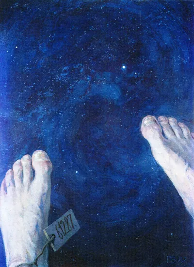— Я тогда не знала, что покойникам вешают такую вот бирку на ноги, и когда папа нам эту картину показал, мы с мамой ее еще крутили вверх-вниз. Если картину «Восхождение» перевернуть, то ноги сверху вниз спускаются, и кажется, что изображен повешенный человек; а если на нее смотреть снизу вверх, то кажется, что это полет во Вселенную. А на бирке, прикрепленной к ноге, написана дата, когда папа закончил эту работу.
