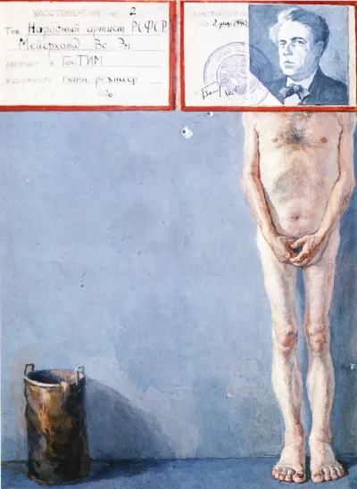 — С «Мейерхольдом» связана интересная история. Когда была задумана эта работа, папа долго искал натурщика… Кто-то из знакомых приходил, ему позировал, но не получалось: для картины нужны были обнаженные ноги и обнаженный торс. В итоге он сам себя нарисовал, свои ноги, отраженные в зеркале. На картине мы видим изможденное, избитое тело Мейерхольда в заключении, а вместо лица — такой парадный портрет на пропуск. Причем папа не знал, конечно, как выглядел пропуск Мейерхольда. Он срисовал удостоверение главного художника Театра Советской Армии и там, где должна быть фамилия, написал «Мейерхольд». Но нужна была дата пропуска «действителен до…»