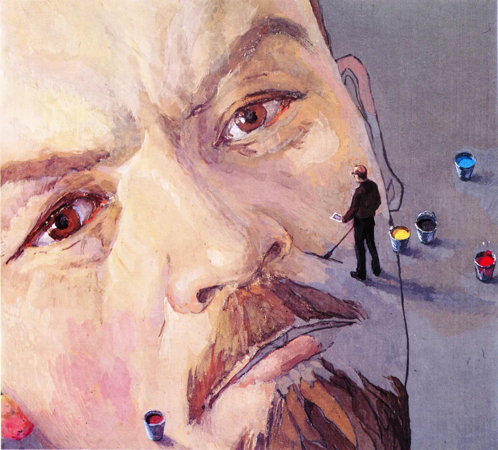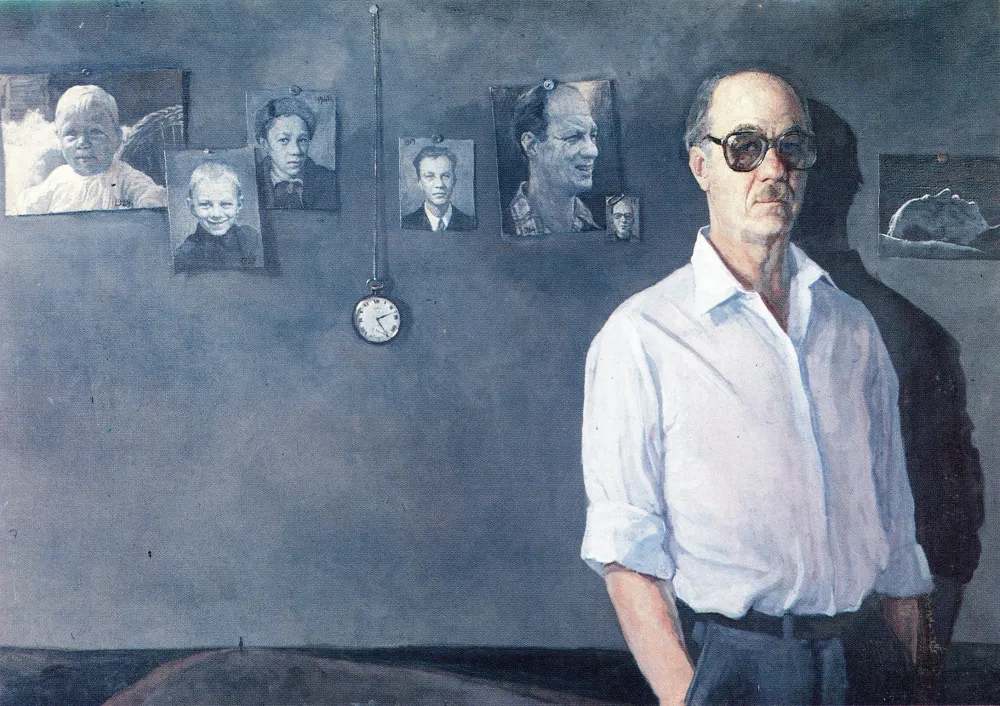 Потом 1977 — маленькая фотография, потом его автопортрет крупным планом, и неожиданно — папина фотография уже на смертном одре. Причем у нас есть фотография, где папа сфотографирован в профиль, и он ее перевернул, расположил горизонтально и писал себя с этой фотографии. А когда пришел из мастерской домой, сказал нам с мамой: «Я себя сегодня писал в гробу, даже самому как-то не по себе стало…» Нам психолог потом сказал, что, когда человек пишет себя на смертном одре, он освобождается от каких-то страхов. Но вообще я не знаю ни одного художника, который нарисовал бы себя на смертном одре. Композиторы писали «Реквиемы», а в живописи подобной темы не возникало. Если вы посмотрите, то на автопортрете папина тень повернута в прошлое, и на дороге в глубине холста видна маленькая уходящая фигурка…
