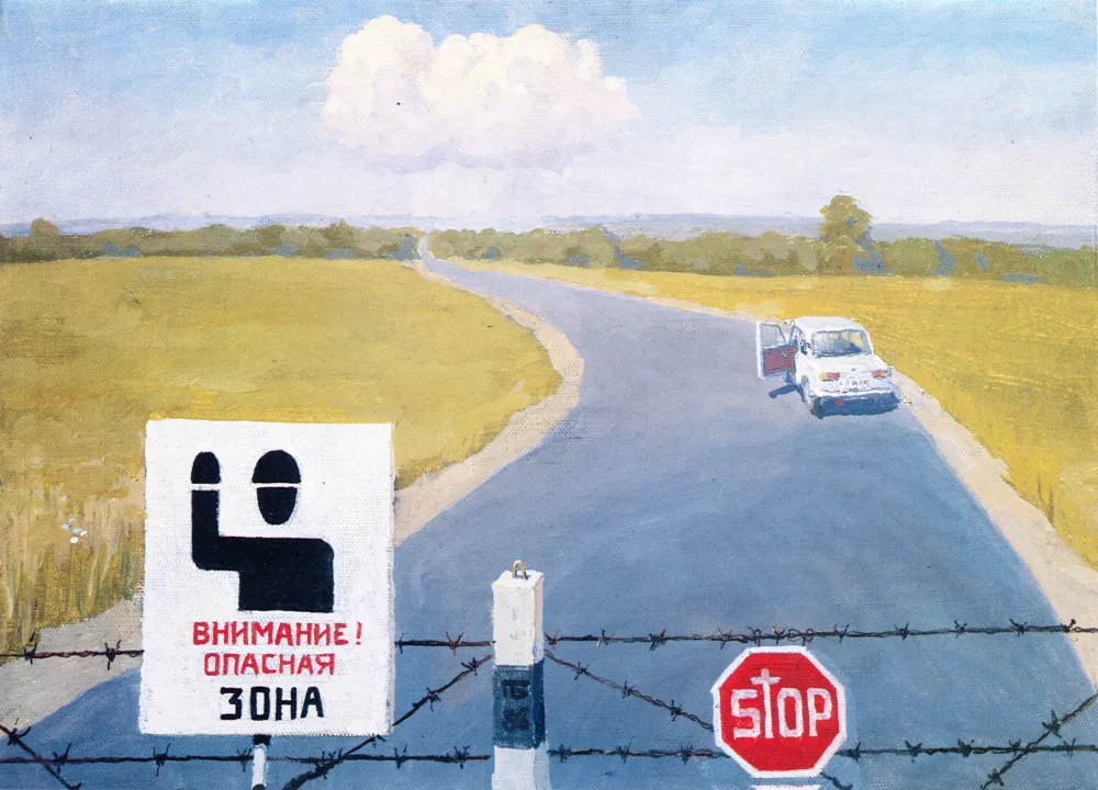 Потом в этот антисталинский цикл мы включили работу «Чернобыль», хотя папа ее к циклу не причислял. В 1986 году группа артистов Театра Советской Армии поехала в Чернобыль с концертами, и папа с ними поехал, хотя не надо ему было туда ехать с больным сердцем после инфаркта, но ему очень хотелось там побывать. И Чернобыль на него произвел большое впечатление: высоченные цветущие травы, а вокруг — радиация, висит знак «Стоп», и буква «Т» у него как крест написана. На это потом уже Ванесса Редгрейв, когда приезжала в Москву, обратила внимание. Мы эту картину впервые выставили в Киеве, когда там проходила выставка.
