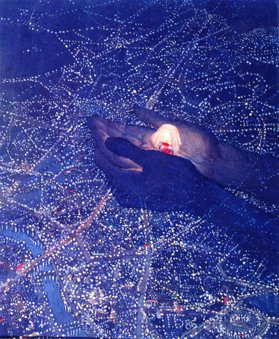 О том, как рождался замысел еще одной картины, нам рассказывала художница по костюмам Татьяна Глебова. Театр возвращался с каких-то гастролей, они летели в самолете, папа посмотрел в окно, увидел море огней, и что-то стал зарисовывать в блокноте. Так родилась работа «Руки над городом», где женские руки держат лампу, излучающую свет. Папа нарисовал руки моей бабушки, маминой мамы (она ему позировала), а изображенная там лампа под абажуром стояла у него в мастерской. Сначала замысел был немного другой: стоит женщина, наклонившись, с бусами, и бусы рассыпаются, и вот эта нитка бус, которая падает, образует эти огни. «Руки над городом» — самая светлая, единственная работа из цикла, которая висит у нас дома, потому что все остальные работы слишком мрачные для того, чтобы висеть на стене.