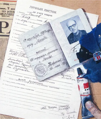 Я тогда работала в Институте искусствознания, на нашем секторе театра работал крупнейший исследователь творчества Мейерхольда Константин Лазаревич Рудницкий, который много лет занимался изучением его жизни и творчества. Первая большая книга советского периода «Мейерхольд» принадлежит именно ему, как и книга в серии «Жизнь в искусстве». Рудницкий был допущен к закрытым архивам, но, естественно, тогда не обо всем можно было писать. Константин Лазаревич был у папы в мастерской в 1987 году. Когда папа показал ему эту работу, Рудницкий назвал дату смерти Мейерхольда — 2 февраля 1940 года, — она тогда еще нигде не была опубликована и нигде не фигурировала. Так что на пропуске в графе «действителен до…» стоит точная дата гибели Мейерхольда. Папа вписал эту дату: это было первое, еще негласное ее опубликование. Уже после папиной смерти в «Огоньке» были опубликованы страшные письма Мейерхольда из заключения. Это всё хранилось в секрете, и, конечно, так трагически никто Мейерхольда еще не изображал.