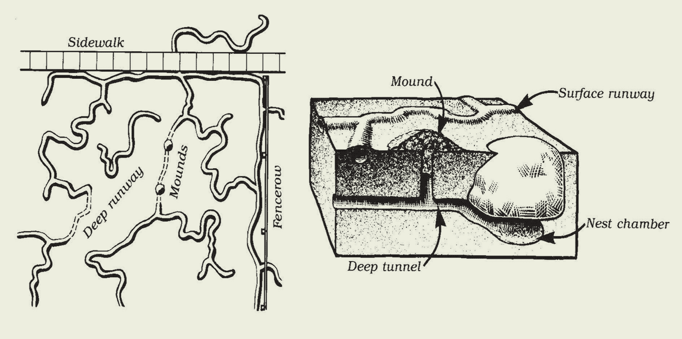 Обычно кроты не живут под земляными холмиками, которые представляют собой лишь побочный продукт их жизнедеятельности, ненужную землю, вытесненную на поверхность. Но есть и исключение, которое ловцы кротов называют «крепостью», — это просто огромный по кротовьим меркам холм. Хамер пишет, что размером он «с перевернутую тележку» или «с овцу». Когда беременная самка крота по каким-то причинам оказывается не в состоянии построить гнездо под землей, она возводит «крепость» над земной поверхностью. И если такое сооружение появилось на вашем садовом участке, то вам, по замечанию автора книги, и правда крупно не повезло: очень скоро здесь окажутся кроты со всей округи.