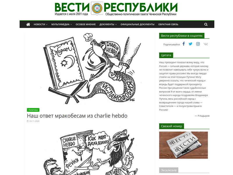 Чеченская газета "Вести Республики", учрежденная министерством информации и печати региона, опубликовала на своем сайте карикатуры на французский сатирический журнал Charlie Hebdo, который известен своими карикатурами на пророка Мухаммеда.