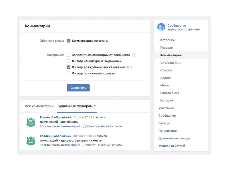 "4 ноября ровно на сутки в настройках сообществ появится возможность включить фильтр враждебных высказываний. Нейросеть удаляет комментарии, в которых содержатся угрозы, - например, пожелания смерти или обещания причинить вред здоровью. При этом администратор сможет увидеть все комментарии, которые отсеял фильтр, и восстановить их или отправить автора в чёрный список. Как и другие фильтры в сообществах, фильтр враждебных высказываний можно включить или выключить в любой момент", - сообщили в компании, уточнив, что результаты эксперимента будут использованы для доработки нейросети.