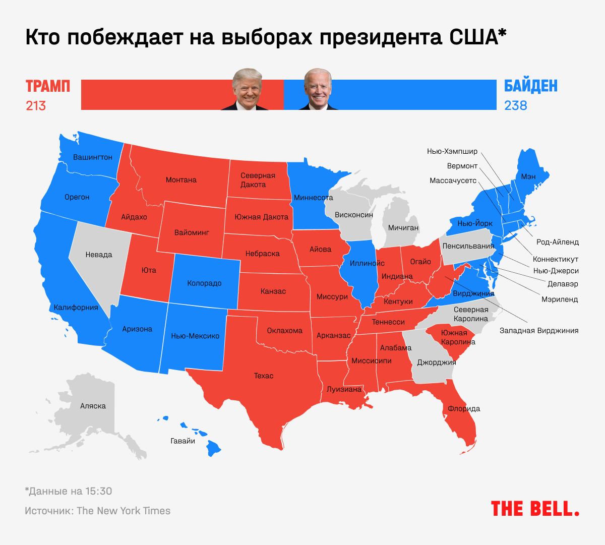 На 13:30 Байден набирал 238 голосов выборщиков при необходимых 270, Трамп — 213 (по Bloomberg). Прореспубликанский Fox давал те же цифры, осторожная The New York Times до сих пор не засчитала Байдену Аризону и дает ему 227 голосов.