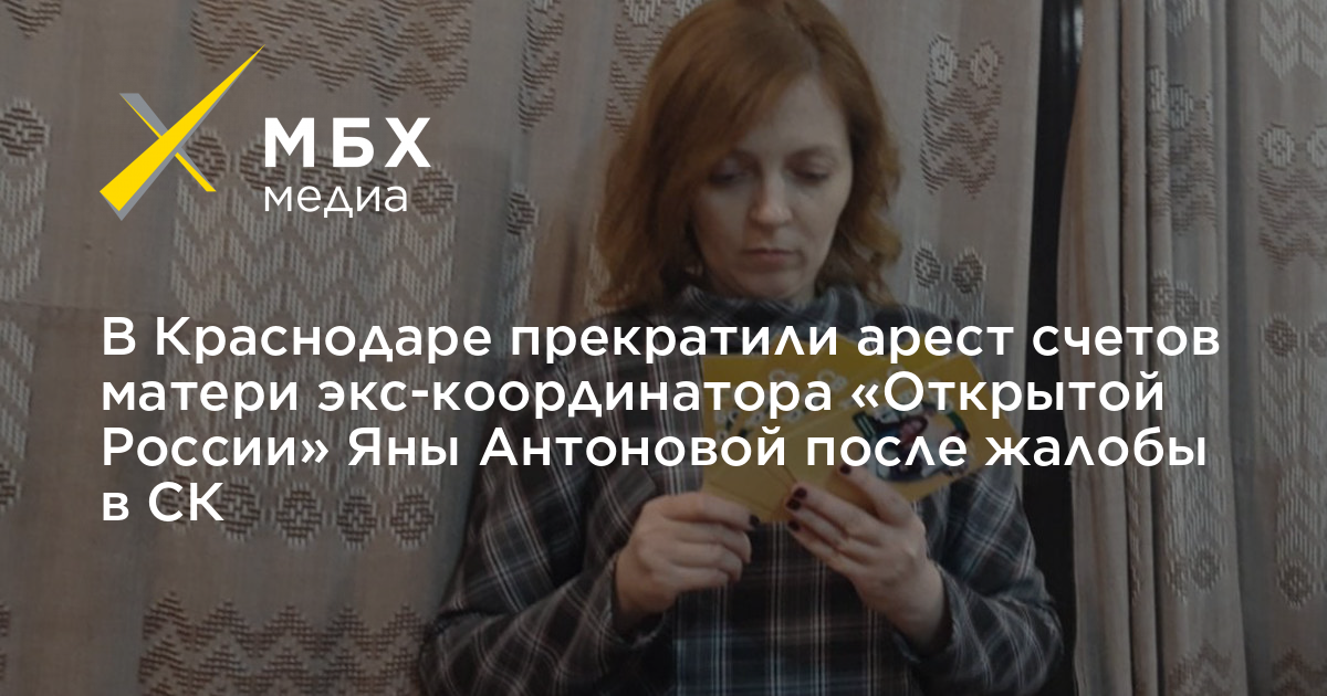 После проведения СК проверки был прекращен арест более 4 млн рублей со счетов матери экс-координатора «Открытой России» в Краснодаре Яны Антоновой. Об этом «МБХ медиа» сообщил координатор «Правозащиты Открытки» Алексей Прянишников.
