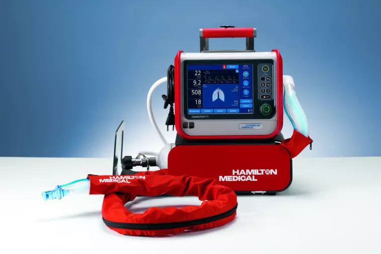 Нamilton-T1 – компактный аппарат ИВЛ, используемый для транспортировки пациентов. На сайте компании производителя говорится, что он предназначен для вооруженных сил.