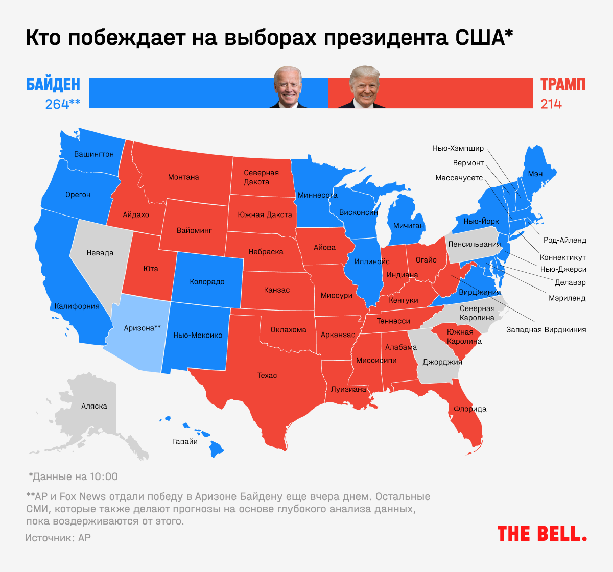 Формально неопределившимися на карте выборов Associated Press остаются пять штатов — Аляска, Невада, Пенсильвания, Северная Каролина и Джорджия. Еще один штат, Аризона, еще вчера днем был закрашен синим и отдан Байдену — но теперь у него есть некоторый шанс сменить цвет. На Аляске Трамп победит точно, а в Северной Каролине — с вероятностью 86%. Это значит, что судьба выборов решится в четырех штатах.
