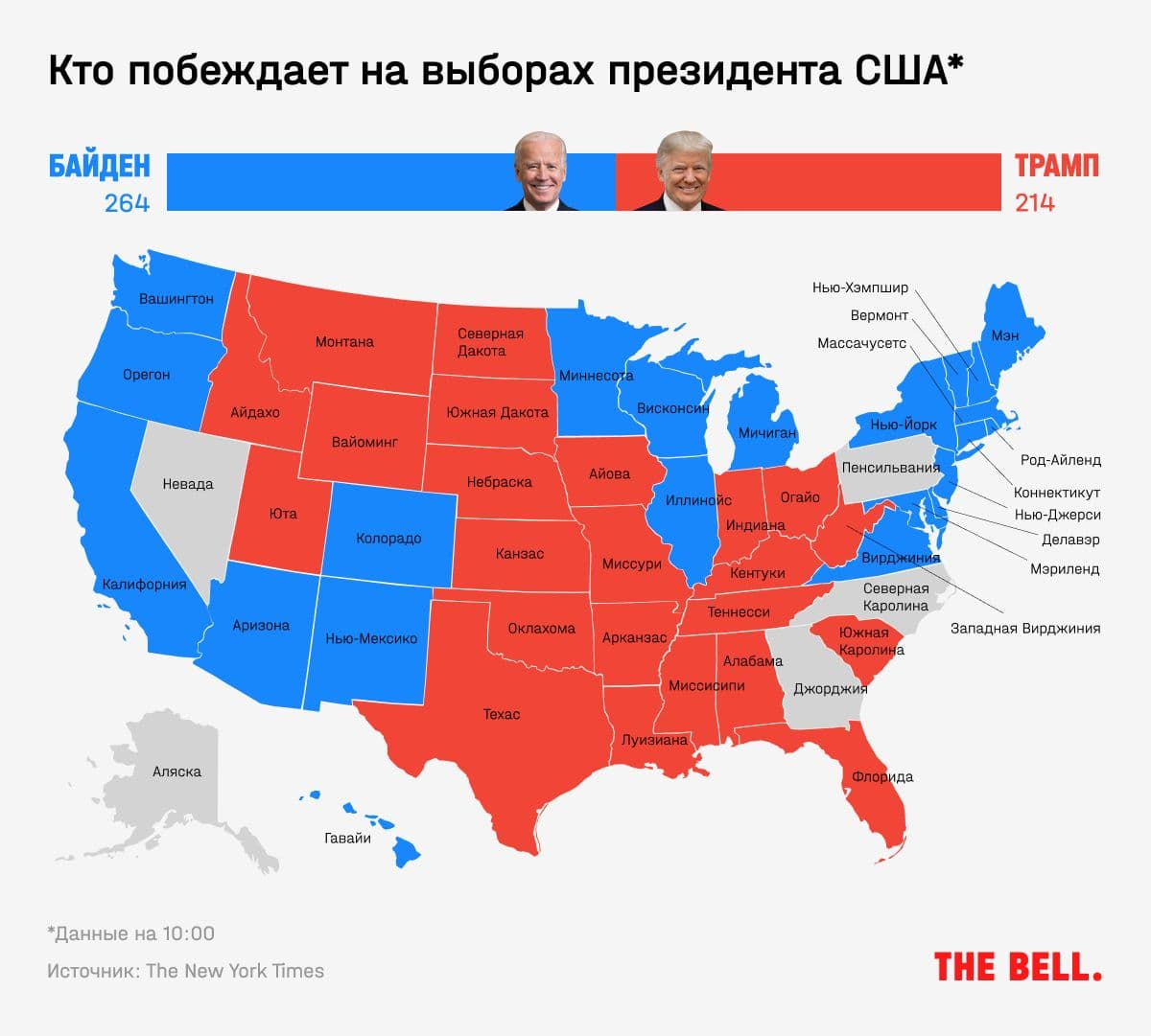 - Победитель пока не определился в пяти штатах — Пенсильвании, Неваде, Джорджии, Северной Каролине и Аляске (но в последней у Байдена нет шансов).