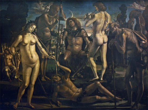 © Bode-Museum, Staatliche Museen zu Berlin Лука Синьорелли. Воспитание Пана. Ок. 1490 В дальнейшем и Аркадия, и Пан странствовали по страницам европейской литературы именно в таком оскопленном вергилиевском изводе. Так, комментируя «Буколики», латинский автор конца IV века Мавр Сервий Гонорат дает следующее описание Пана: «Рога его напоминают лучи солнца и рожок месяца, грудь его покрыта плащом, усеянным звездами, что соотносится с небом <...> свирель с семью трубками указывает на небесную гармонию» (II, 31). Таким же Пан появится вновь у мастеров Возрождения: например, в канцонах Якопо Саннадзаро, называвшего его «Великим Пастырем», или на погибшей в 1945 году в Берлине картине Луки Синьорелли «Воспитание Пана». Синьорелли, поддерживавший дружеские отношения со многими философами и поэтами Платоновской академии во Флоренции, написал эту картину около 1490 года для Лоренцо Медичи и выстроил ее по схеме Sacra conversazione — Святого собеседования; но вместо Девы Марии, сидящей на троне с младенцем Иисусом на коленях, в центре картины — Пан. В окружении Мудрости, Красоты и Музыки [17] он правит миром, будучи сам миром: плащ его — звездное небо, рога — месяц.