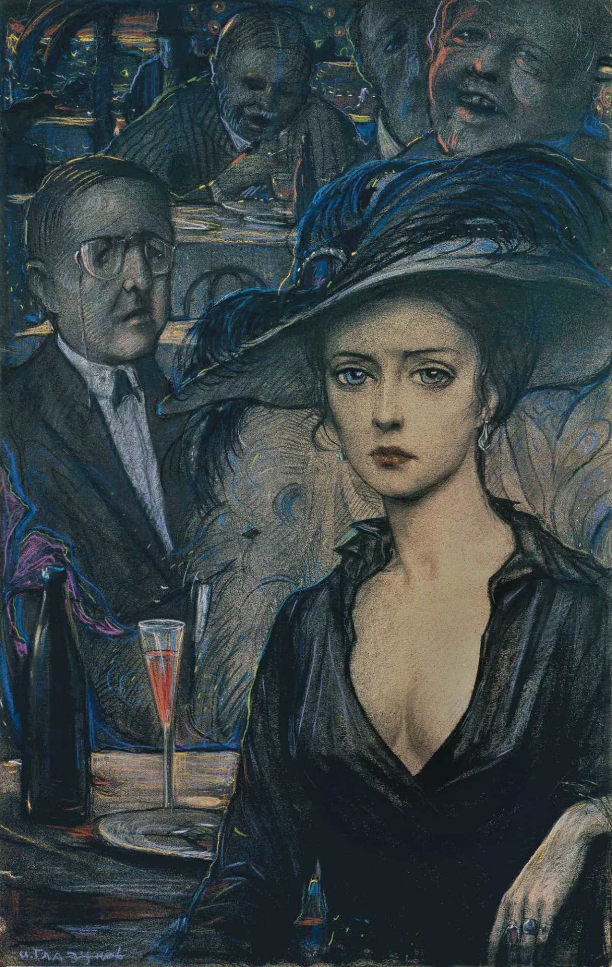 — То умерло... — сказала она и поднесла к губам узкую, длинную рюмку с вином». Количество совпадений с блоковским текстом просто зашкаливает! Конечно, Блок мог читать рассказ Нины Петровской, но на самом деле это некий типический облик того времени. Например, на картине Льва Бакста «Ужин», которая в 1903 году вызвала скандал на выставке «Мира искусства», есть и узкая рука, и кольца, и бокал с вином. Нету «перий», но есть черное платье. Таким же образом была стилизована актриса Лидия Ильяшенко, которая играла Незнакомку в мейерхольдовской постановке 1914 года. В общем, я думаю, что и Петровская, и Блок, и Бакст — все они реагируют на одну и ту же действительность, которая, попав в текст, возвращается обратно в реальность за подписью Блока. И тогда все эти детали становятся блоковскими.