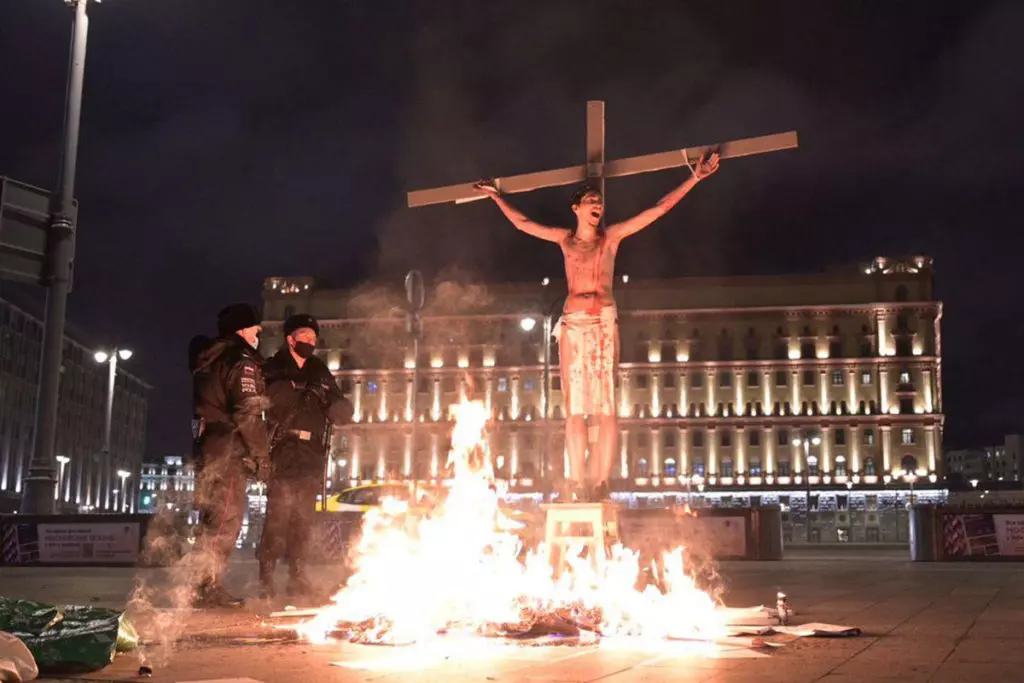 В четверг вечером у здания ФСБ на Лубянке в Москве прошла акция: один из активистов был «распят» на кресте и подожжен. Он кричал «Долой полицейское государство!» и «Свободу политзаключенным!». Другие активисты, одетые в плащи с нашивками «ФСБ», бросали в огонь тома «уголовных дел» с надписями «Дело Бориса Немцова» или «Дело сестер Хачатурян».