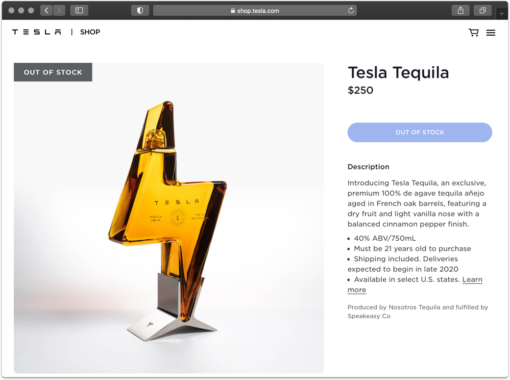 Tesla Tequila продается в бутылке 0,75 литра в форме электрической молнии, ее цена составляет 250 долларов США. Несмотря на высокую цену и ограничение в две бутылки на одного покупателя уже через несколько часов вся текила была раскуплена. Доставить ее Tesla обещает до конца года; когда в продаже появится новая партия, неясно.
