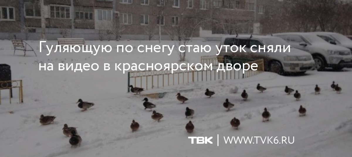 Гуляющую по снегу стаю уток сняли на видео в красноярском дворе