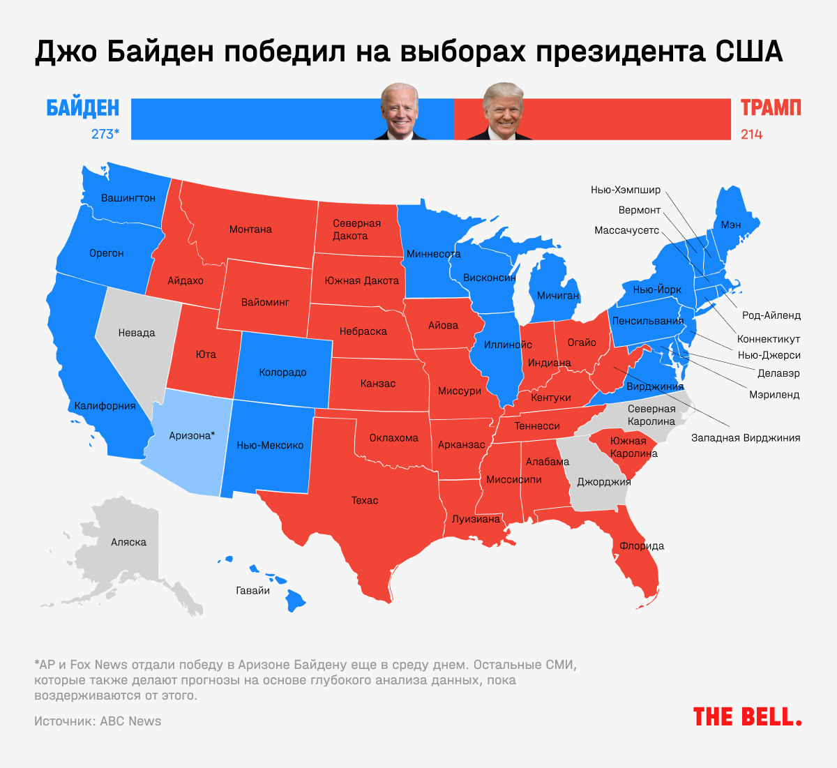 Теперь отрыв Байдена от Трампа в общем зачете превышает необходимые для победы 270 голосов выборщиков по оценке всех крупнейших СМИ. Минимальное число голосов (273) Трампу отдает ABC News, максимальное (290) — прореспубликанский Fox News, который уже засчитал Байдену победу в Аризоне и Неваде.
