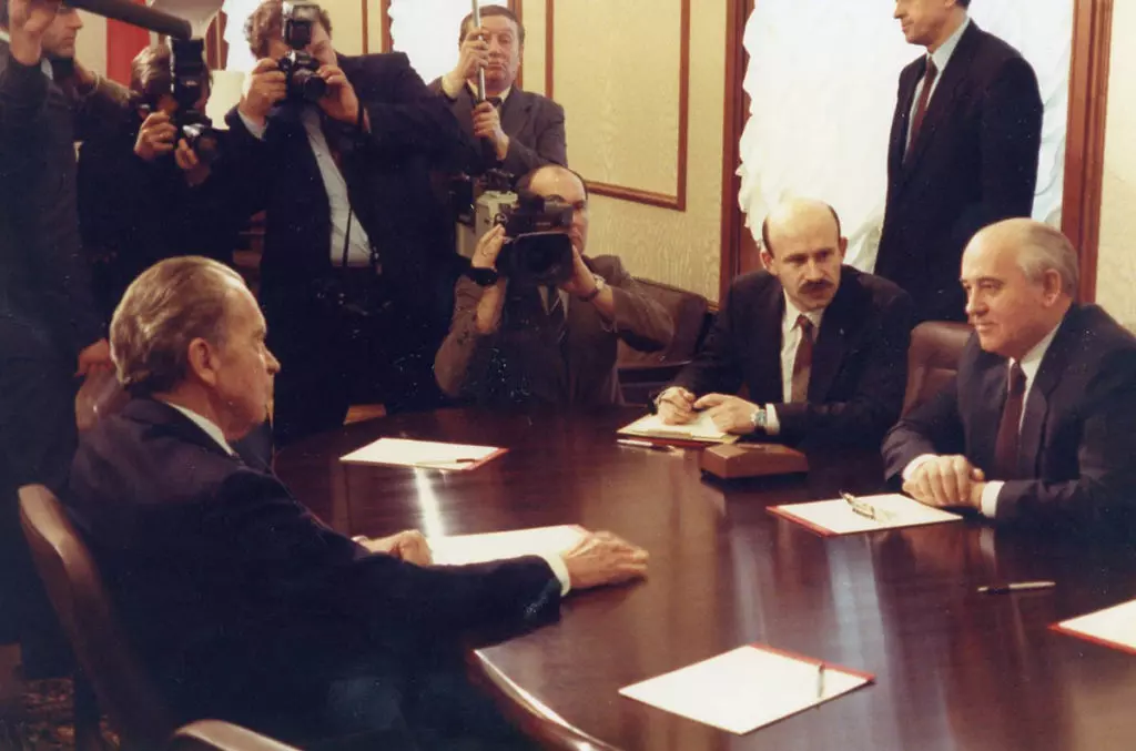 В начале апреля в Москве появился Ричард Никсон. В августе 1974 года ему пришлось уйти в отставку под угрозой уголовного преследования, от которого его спасло решение его преемника Джеральда Форда воспользоваться президентским правом помилования без суда. Это решение – помиловать Ричарда Никсона «за любые преступления, которые он совершил или мог совершить или в которых он участвовал» – было в Америке непопулярным и, скорее всего, лишило Форда шансов на избрание в 1976 году. А Никсон понемногу вышел из тени и вошел в роль одного из старейшин Республиканской партии. Горбачев уделил ему полтора часа своего времени.