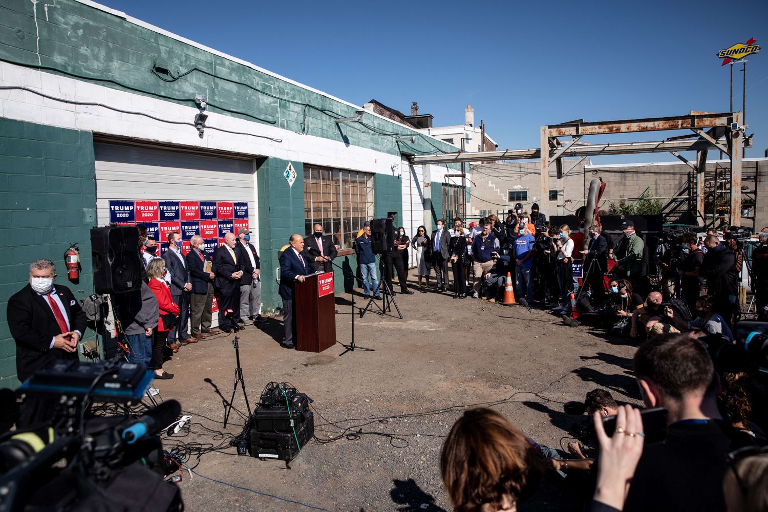 И представители штаба Трампа во главе с его юристом Руди Джулиани действительно провели свое выступление именно там — на парковке во дворе магазина садоводческих товаров в промзоне у шоссе на выезде из Филадельфии, среди автомастерских и напротив крематория.
