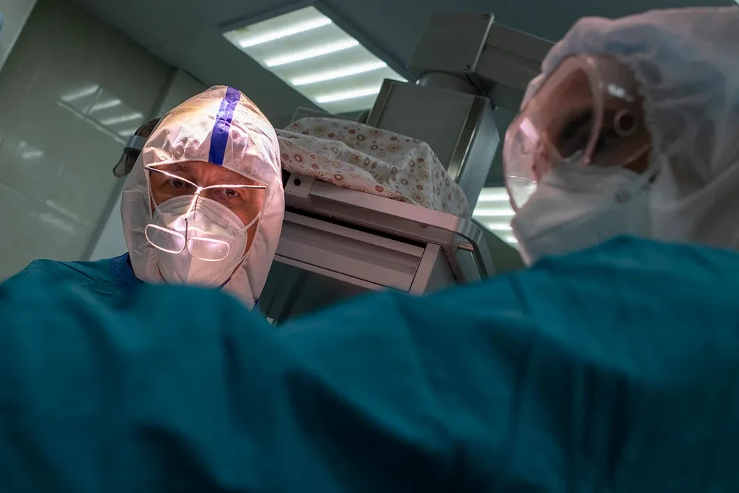 Оперирует Майтесян Дереник Агванович. Очки — изогнутые полукружья на дужке — вынесены далеко от лица, увеличивают каждое движение. До пандемии он возглавлял отделение сосудистой хирургии. 70% заведующих сменилось, пришли молодые — «не отягощенные багажом, более настроенные на борьбу». Он сам переболел ковидом. «Час могу оперировать, два могу, на третий задыхаюсь».