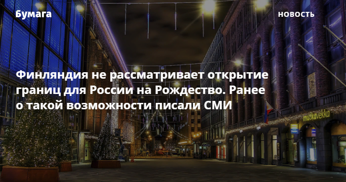О том, что границы для российских туристов могут открыть к 25 декабря, когда большинство христиан празднует Рождество, 9 ноября писали многие российские СМИ со ссылкой на финский портал Yle. Однако в генконсульстве «Бумаге» сообщили, что, хоть Финляндия и рассматривает возможность открытия границ для некоторых стран, России в этом списке нет.