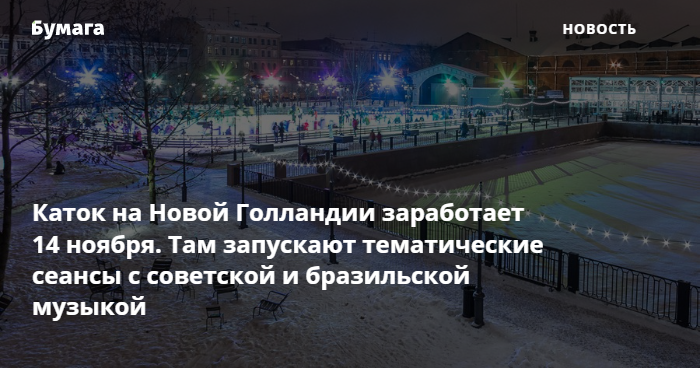 В субботу, 14 ноября, на Новой Голландии заработает каток. Он, как и в прошлые годы, будет обустроен на месте газона перед главной сценой, рассказывают в пресс-службе общественного пространства.