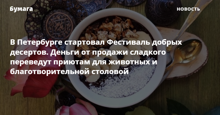 В Петербурге начался осенний Фестиваль добрых десертов, рассказали «Бумаге» организаторы события. Фестиваль продлится до конца ноября, его цель — помочь приютам для животных «Четыре лапы» и «Пушдомик», а также «Благотворительной Мальтийской столовой» на улице Чайковского.