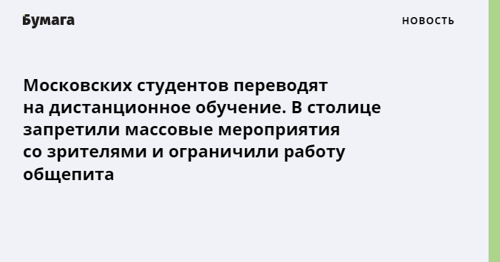 На дистанционное обучение переведут студентов городских вузов и колледжей. Правительство Москвы рекомендует федеральным и частным образовательным учреждениям принять ту же меру. Транспортные карты студентов временно заблокируют.