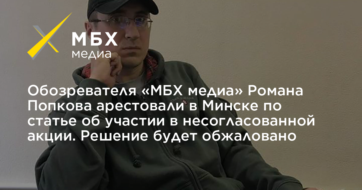 Обозревателя «МБХ медиа» Романа Попкова арестовали в Минске на 15 суток по статье об участии в несогласованной акции (часть 1 статьи 23.34 КоАП Белоруссии), апелляционная жалоба на это решение будет подана завтра. Об этом сообщил «МБХ медиа» адвокат Антон Гашинский, который ознакомился с материалами дела и постановлением суда.