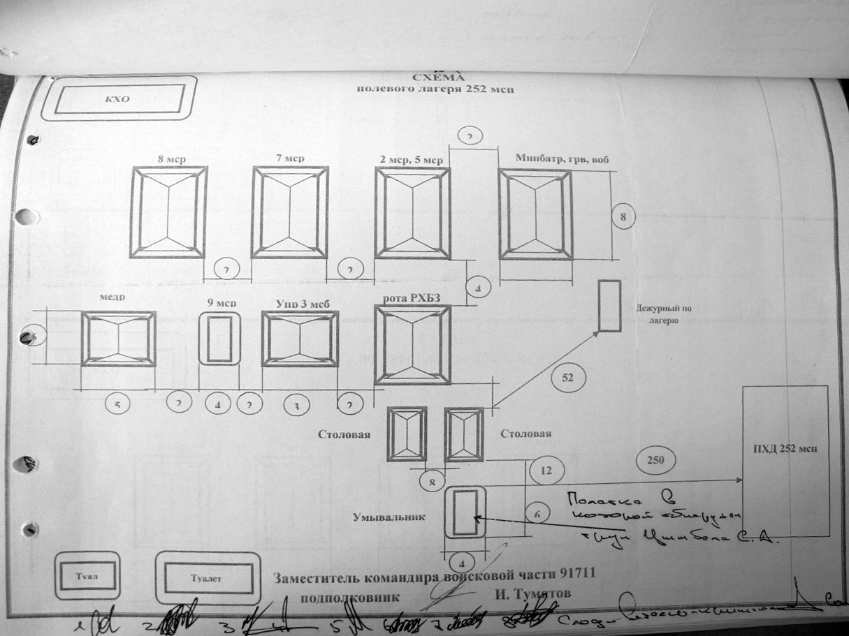 Один рядовой рассказал, что слышал, как в палатку-котломойню на пять минут забежали несколько человек. Сам он ничего не видел, так как в это время сидел в столовой по соседству, а когда вышел, уже застал суматоху, поднявшуюся из-за обнаружения трупа. СК провел следственный эксперимент, по результатам которого выяснилось, что свидетель «в двух из пяти попыток не определил точное количество лиц, проходящих рядом с палаткой».