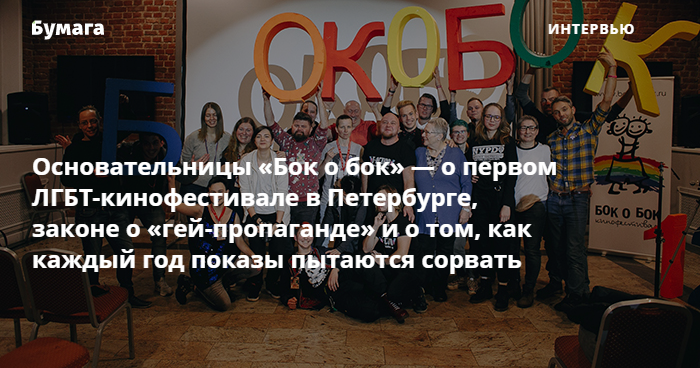 «Бок о бок» организуют уже больше 12 лет — и почти каждый год показы пытаются сорвать с помощью анонимных звонков о минировании и жалоб на «гей-пропаганду». В этом году за три дня до фестиваля организаторов вызвали в полицию из-за жалобы депутата Милонова.