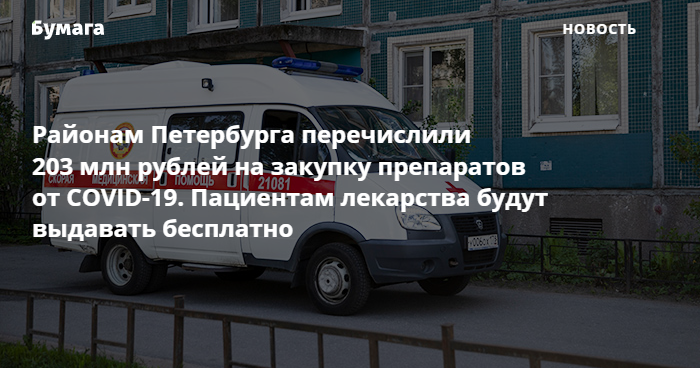 Районам Петербурга перечислили 203 миллиона рублей, выделенных правительством России. Их потратят на закупку препаратов для лечения COVID-19, пишет ТАСС со ссылкой на комитет по здравоохранению.