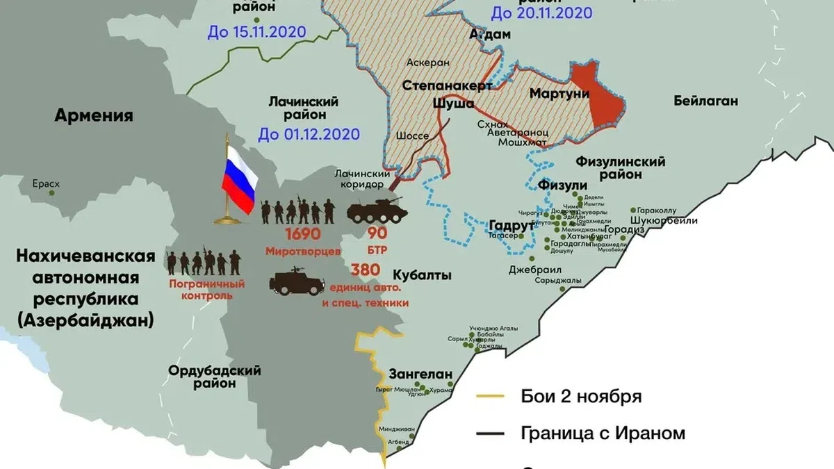 По его словам, вдоль линии соприкосновения сторон в Нагорном Карабахе и Лачинском коридоре развернули десять наблюдательных постов. Передовые подразделения бригады дошли до города Шуша, в зоне ответственности «Юг» развернуто еще четыре поста.