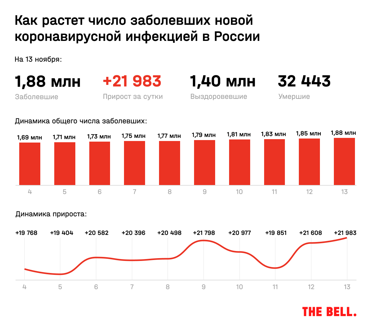 За сутки в России выявлено 21 983 заболевших коронавирусом — это новый антирекорд. При этом у каждого четвертого пациента COVID-19 протекал бессимптомно. Умерли 411 человек — третий день подряд фиксируется более четырех сотен летальных случаев.