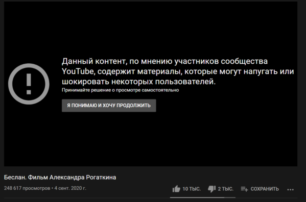 В Google не считают происходящее «цензурой»: блокировку «Царьграда» объяснили санкциями, заглушки в фильмах о Беслане и США — заботой о безопасности пользователей. Предупреждающая надпись при этом не блокирует доступ к видео — достаточно нажать на одну кнопку.