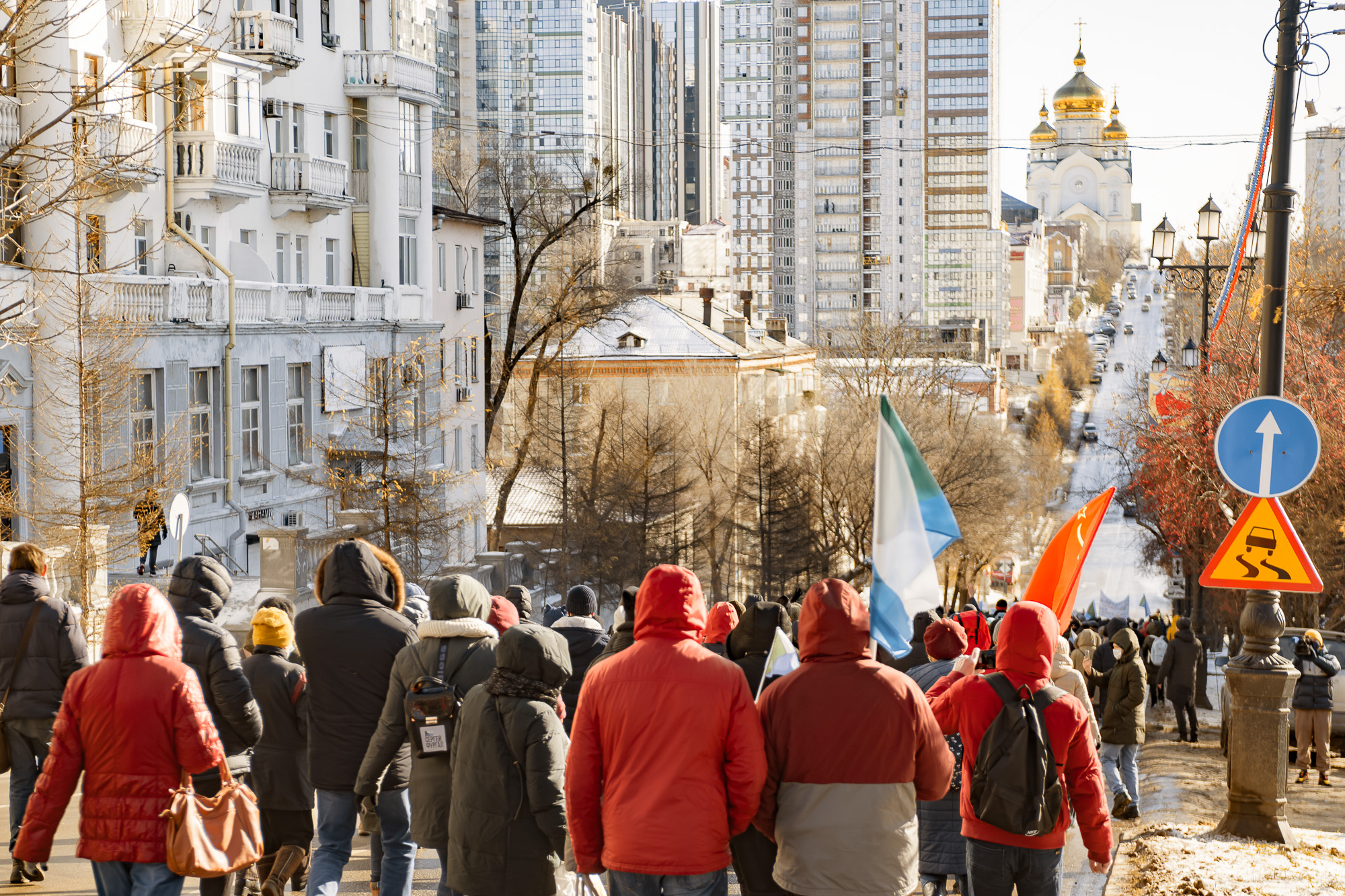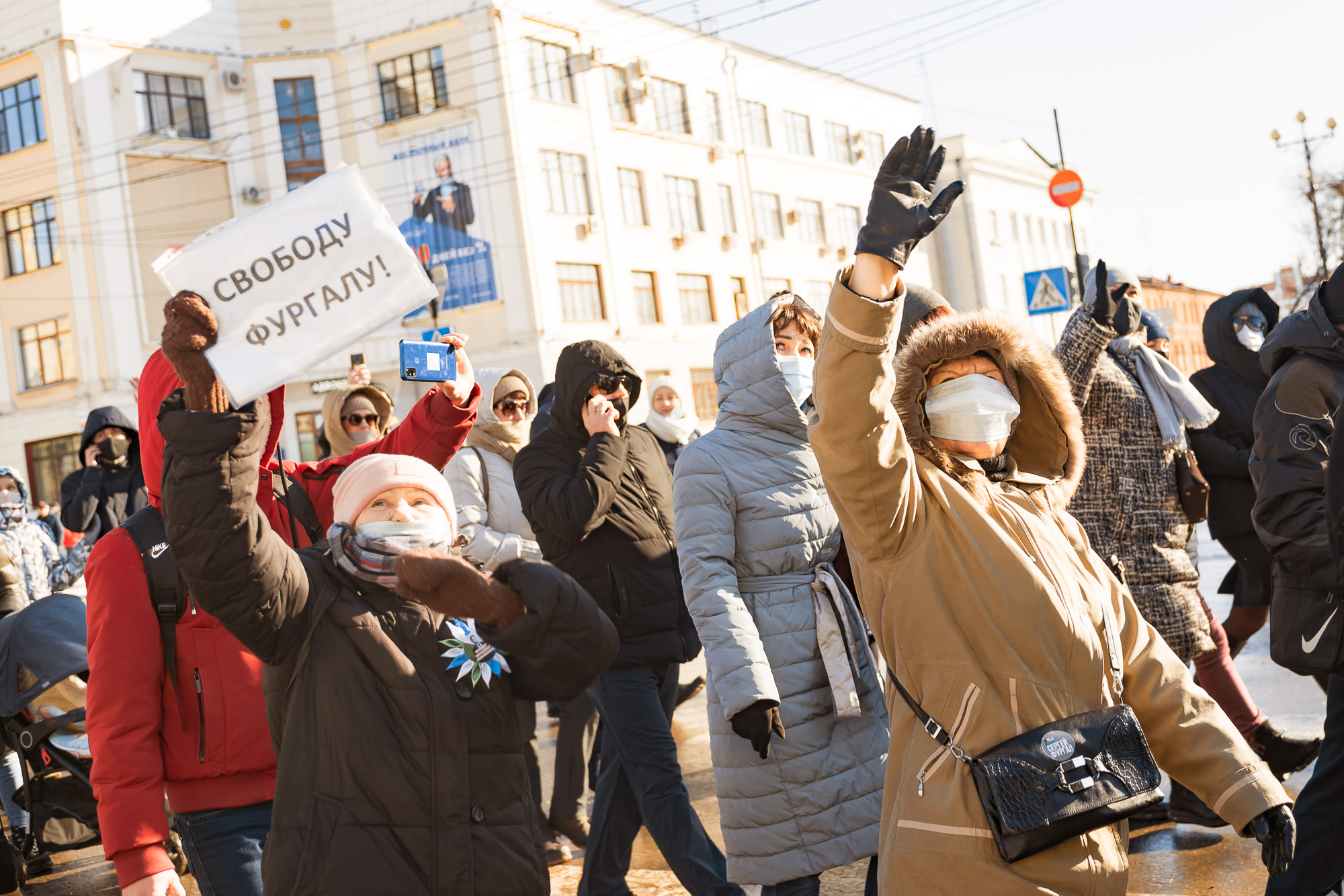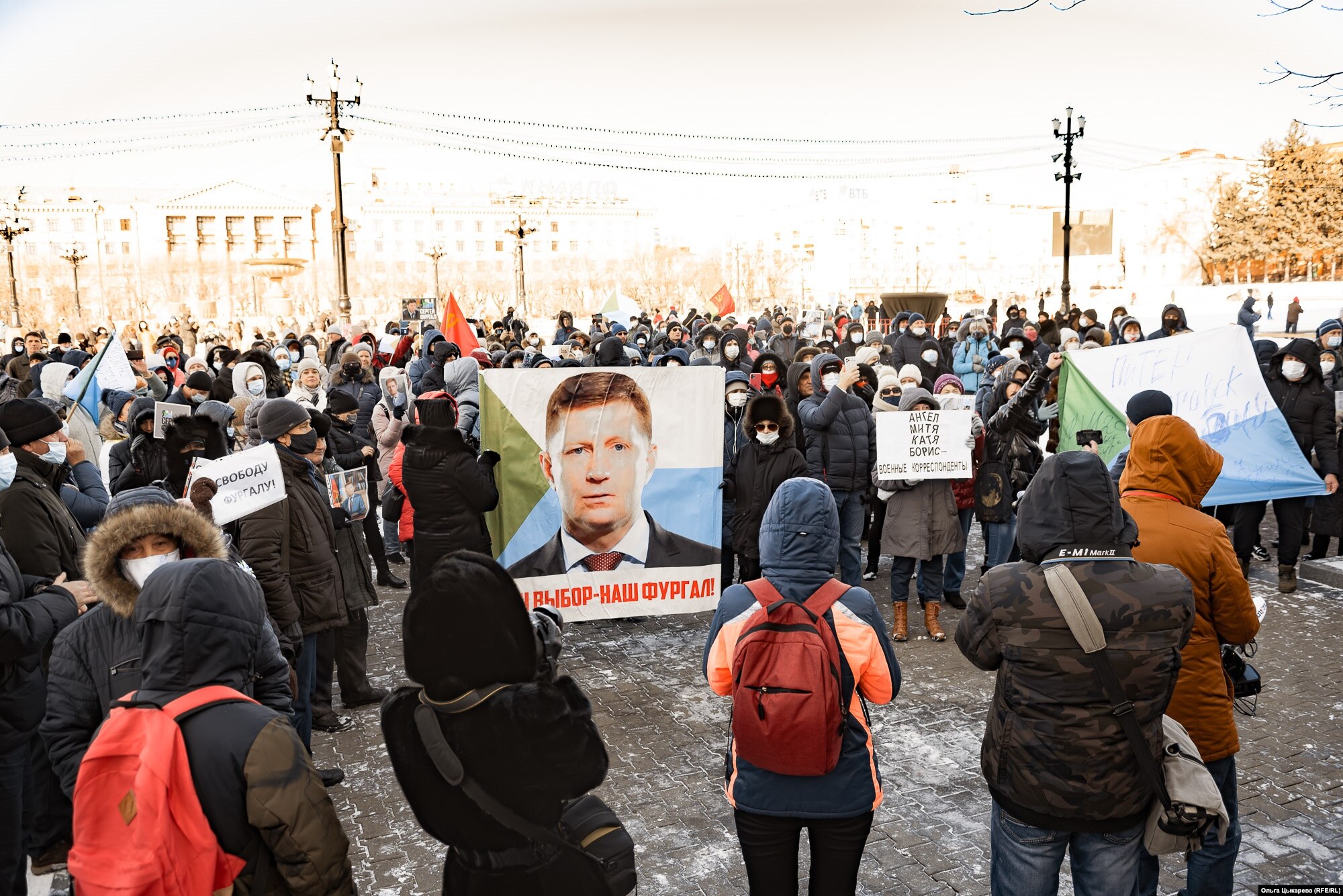 Во время шествия протестующие снова скандировали "Путина под суд", "Прекратите аресты участников протеста", "Это наш край". Плакатов и транспарантов с каждым митингом становится все меньше, сегодня некоторые из них были посвящены именно арестам и задержаниям журналистов.